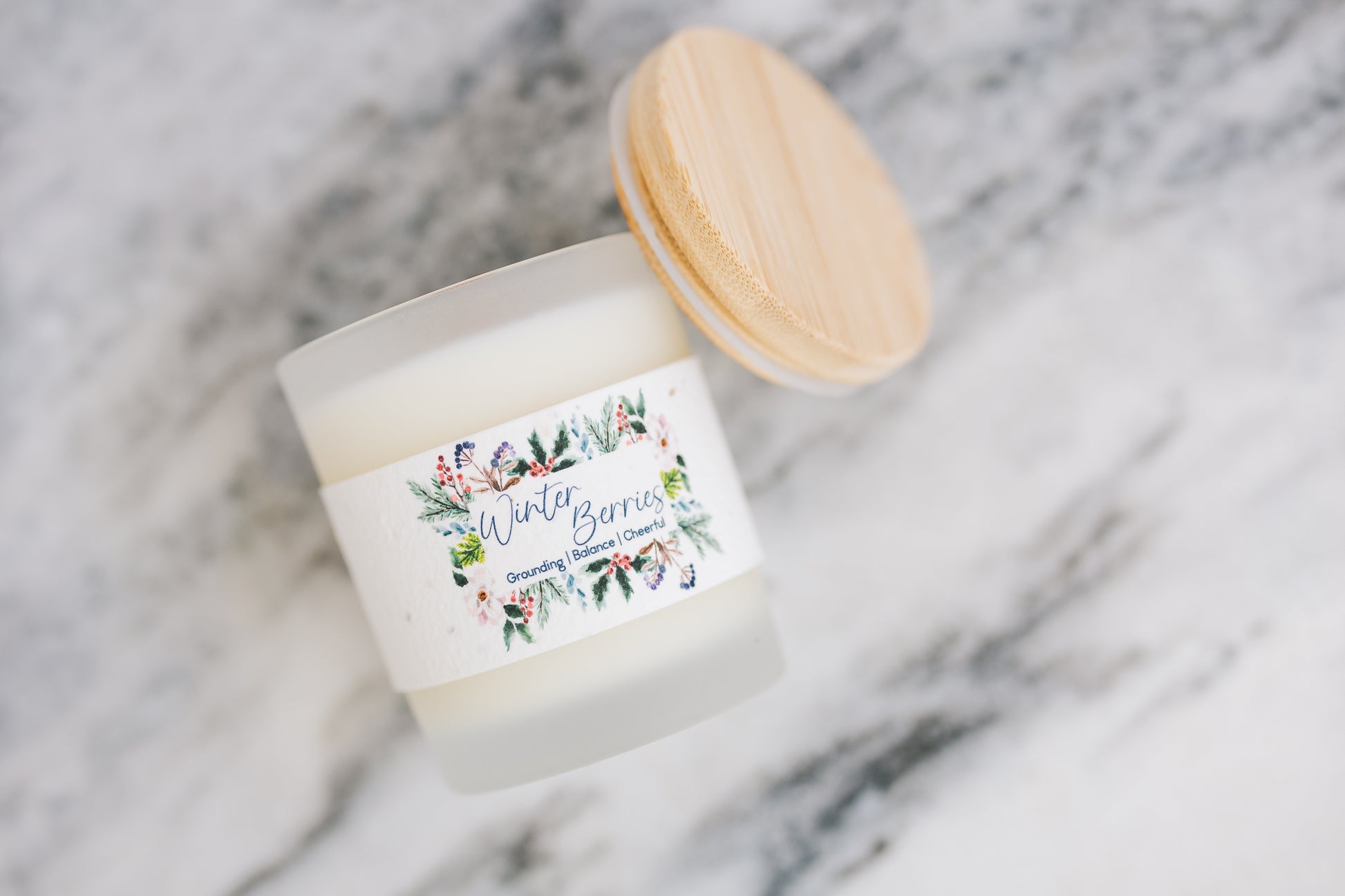 Each candle is wrapped in a plantable label embedded with wildflower seeds and finished with a bamboo lid.